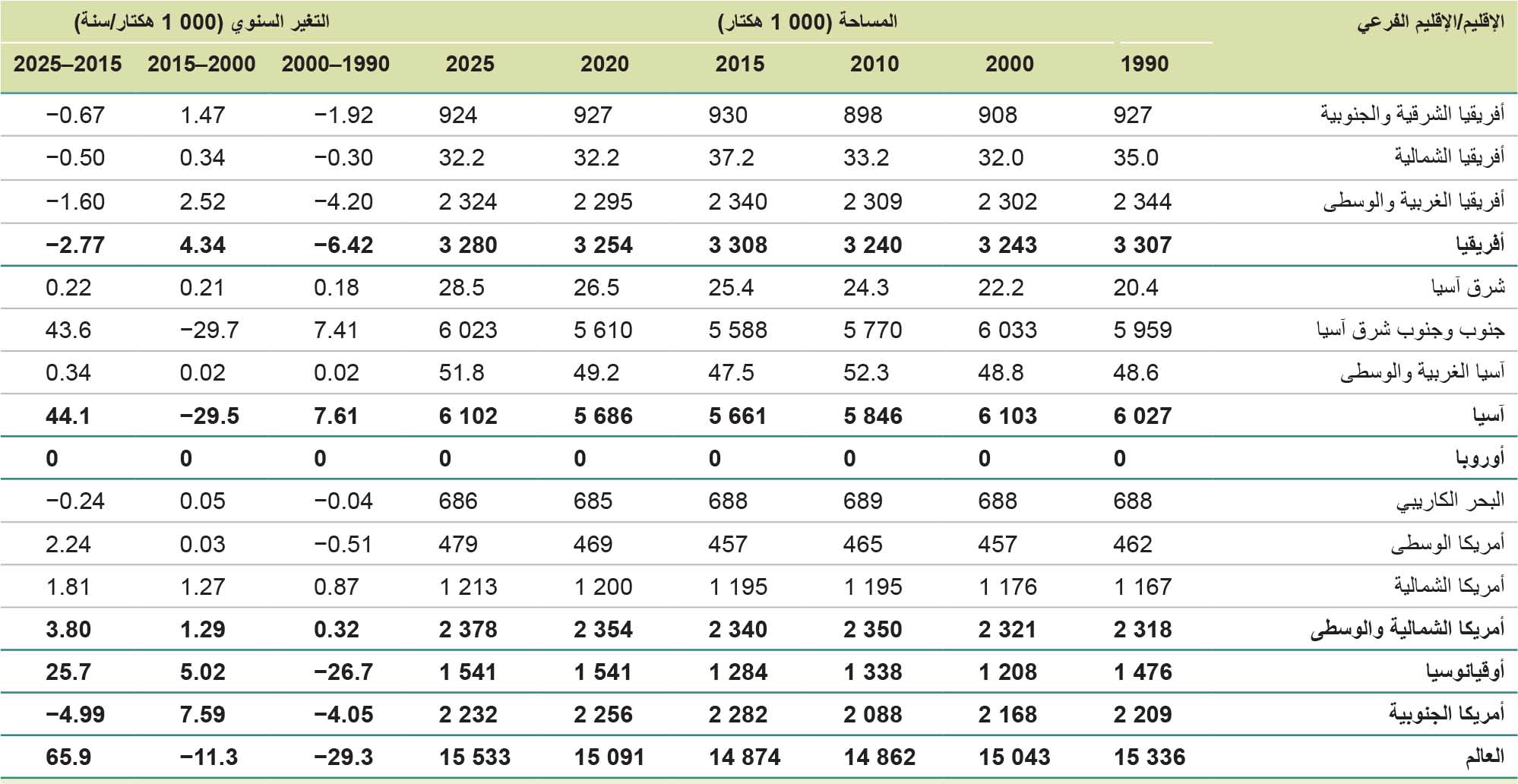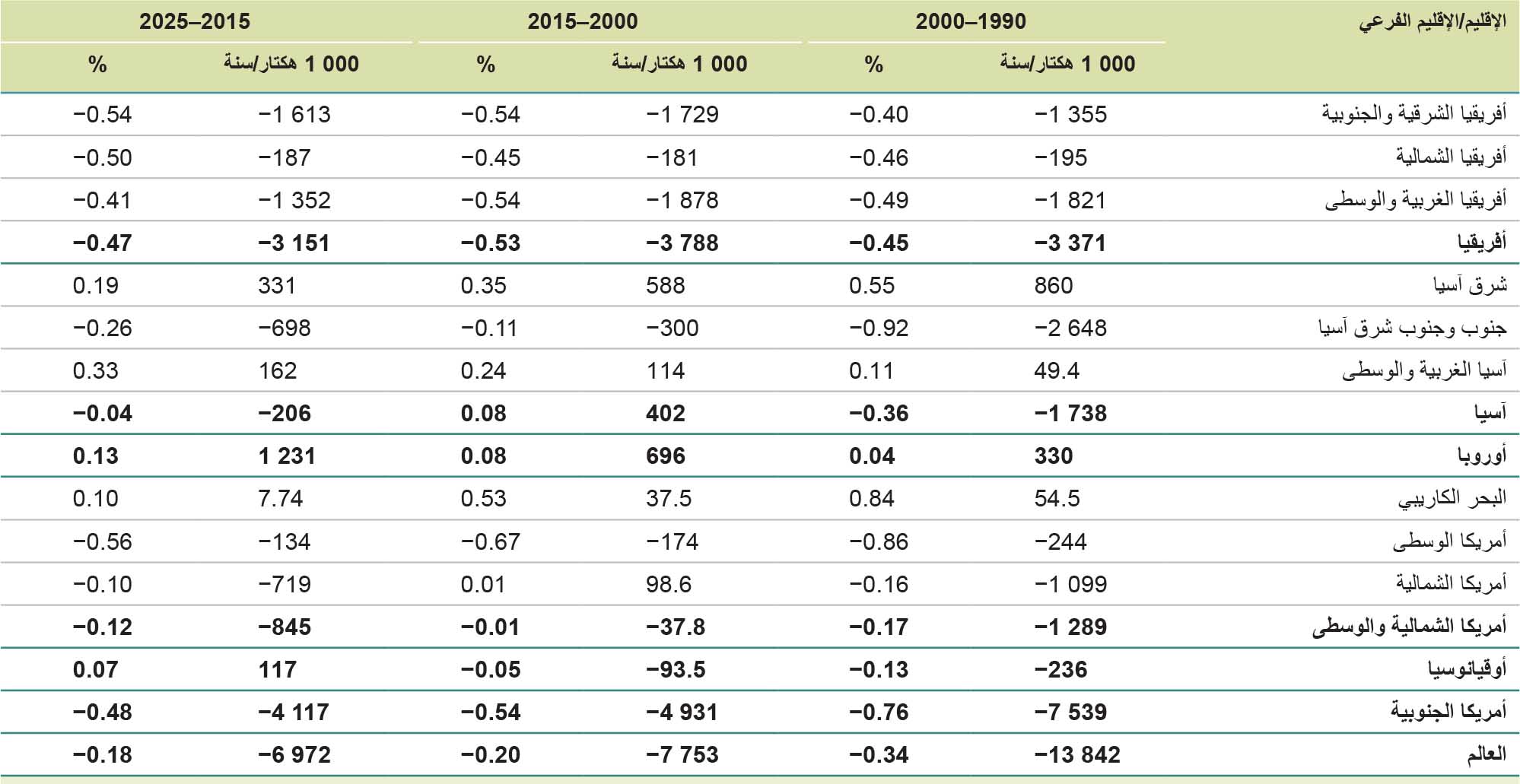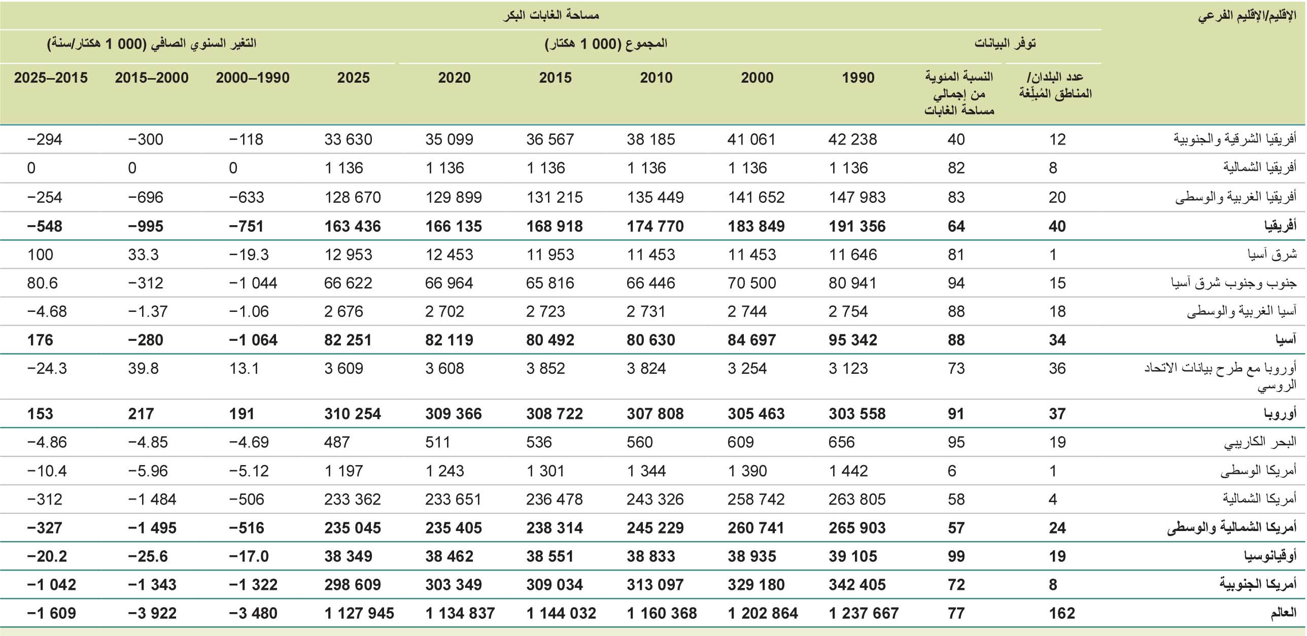 الجدول 21. مساحة الغابات البكر والتغير السنوي الصافي، بحسب الأقاليم والأقاليم الفرعية، 1990-2025