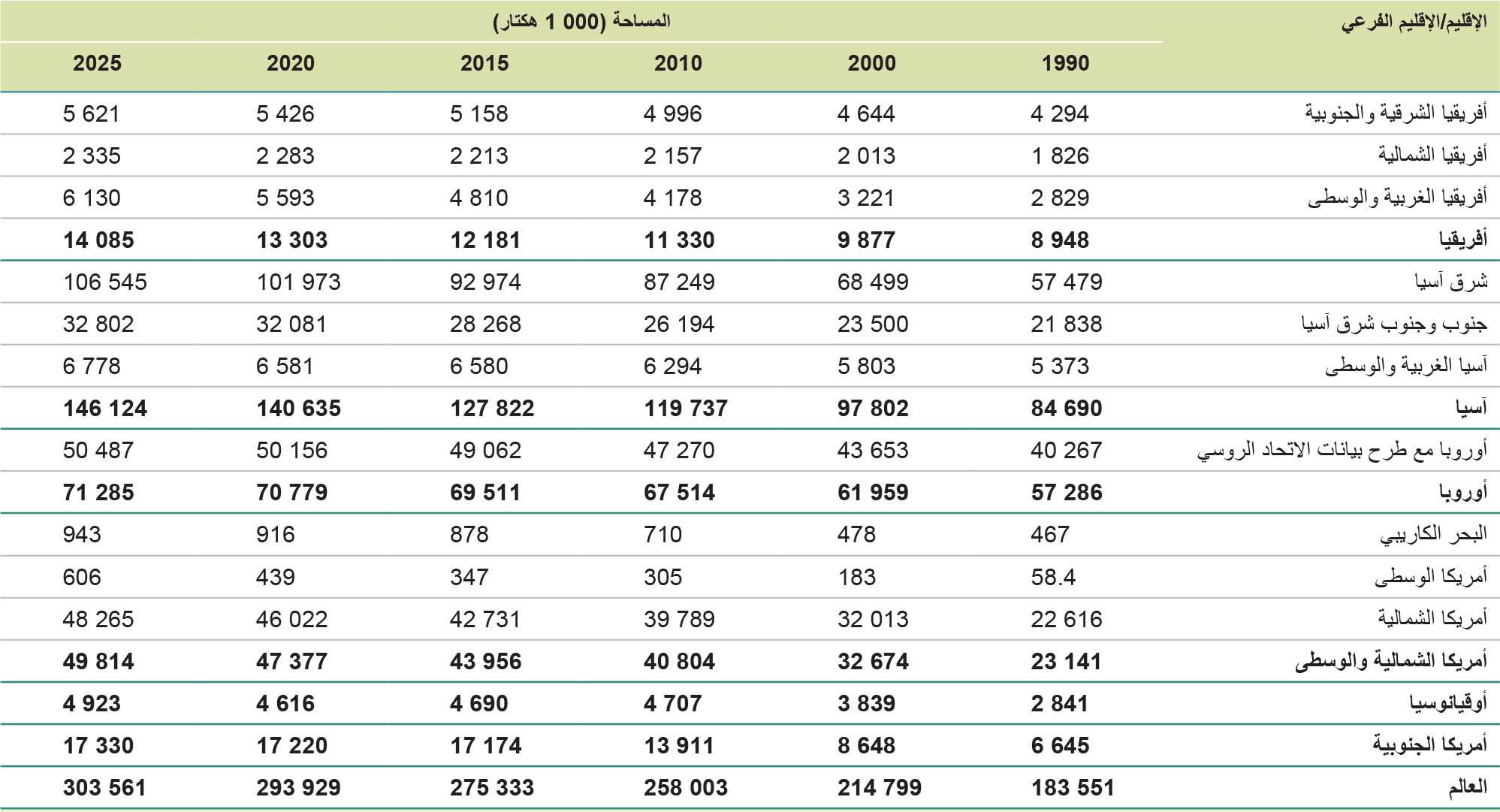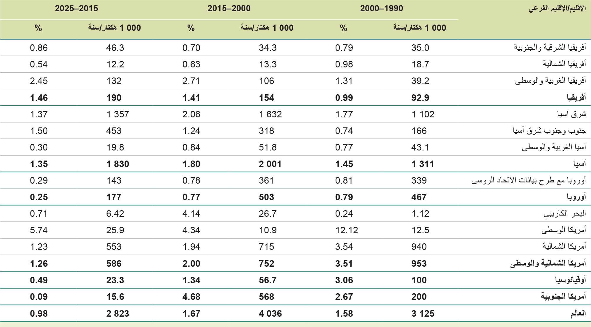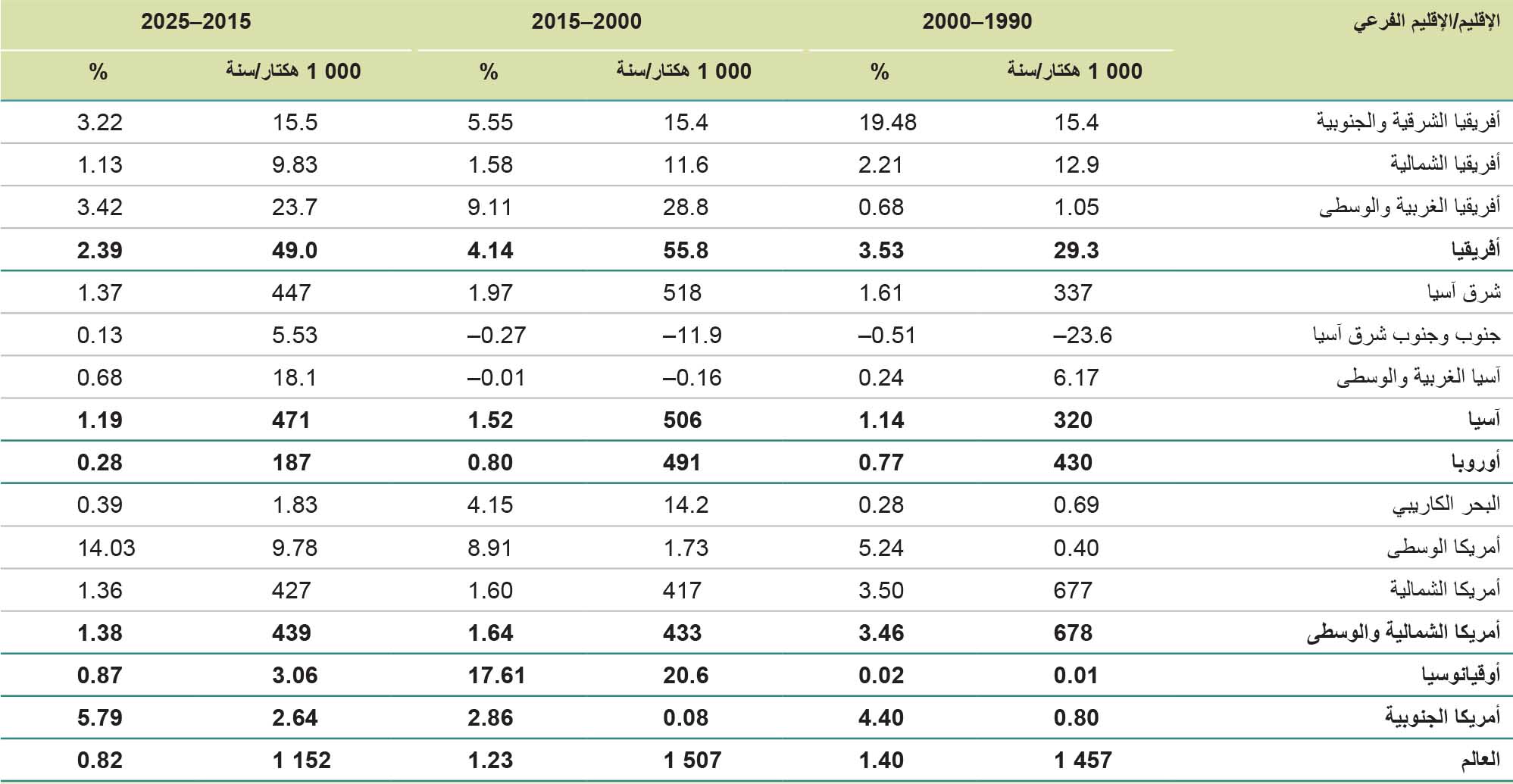 الجدول 21. مساحة الغابات البكر والتغير السنوي الصافي، بحسب الأقاليم والأقاليم الفرعية، 1990-2025