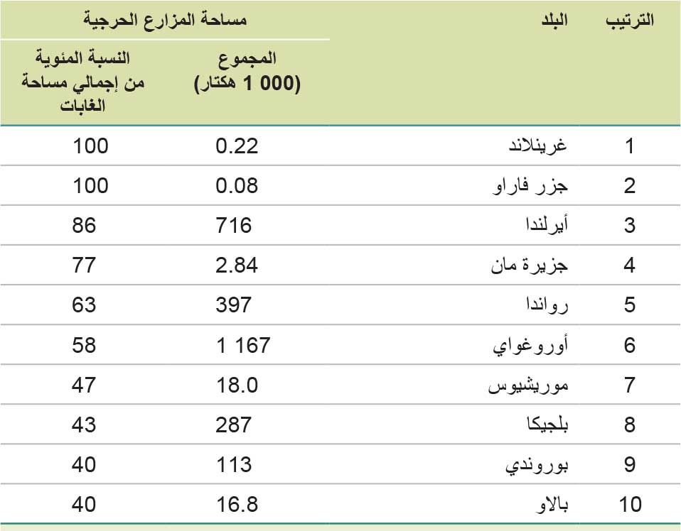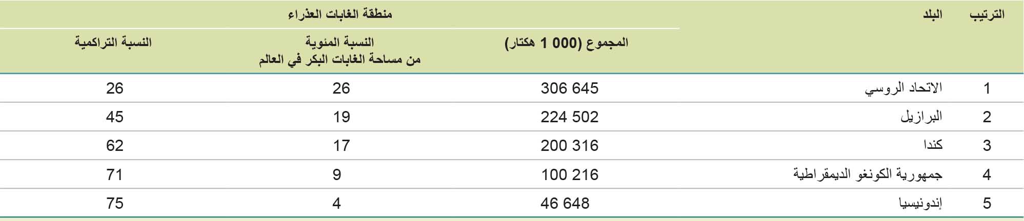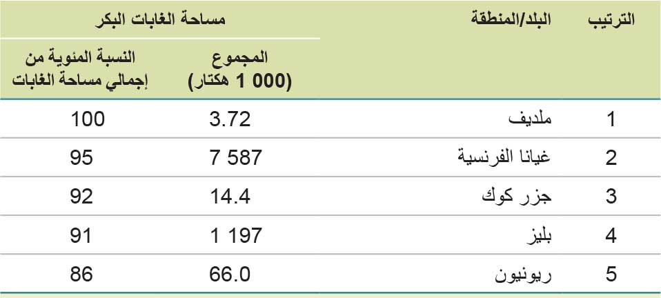 الجدول 19. البلدان والمناطق الخمس الرئيسية للغابات البكر كنسبة من إجمالي مساحة الغابات، 2025