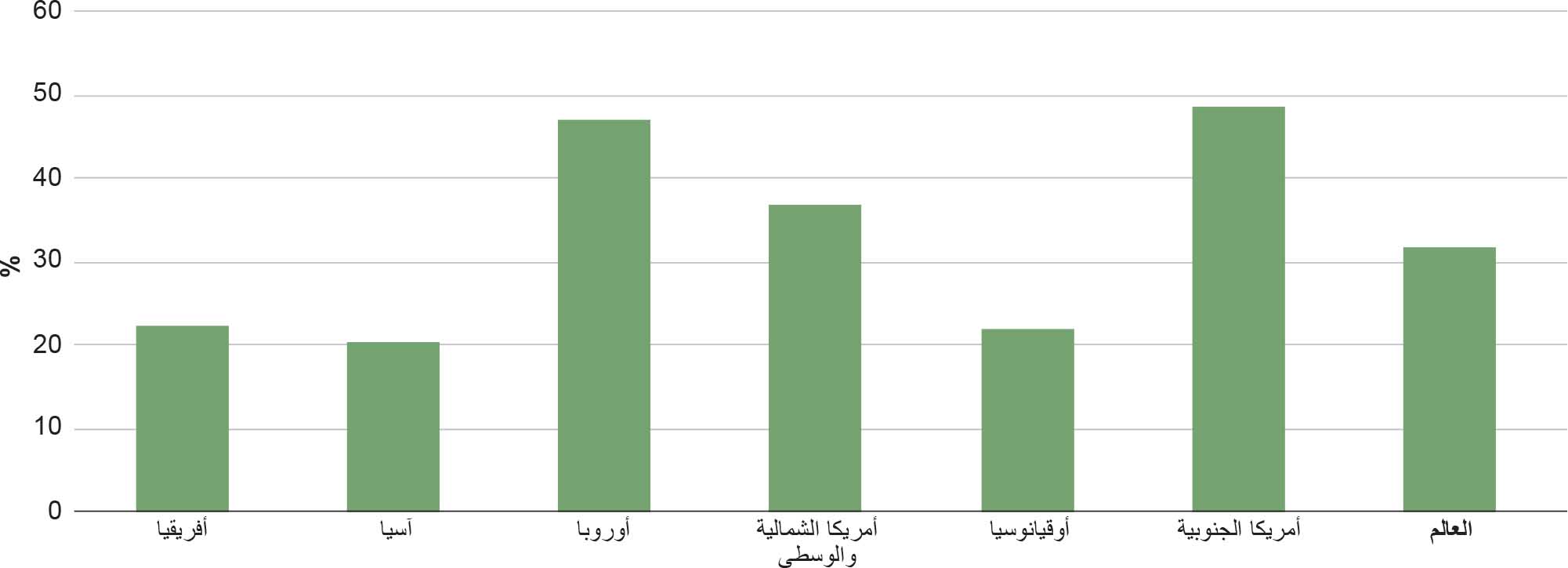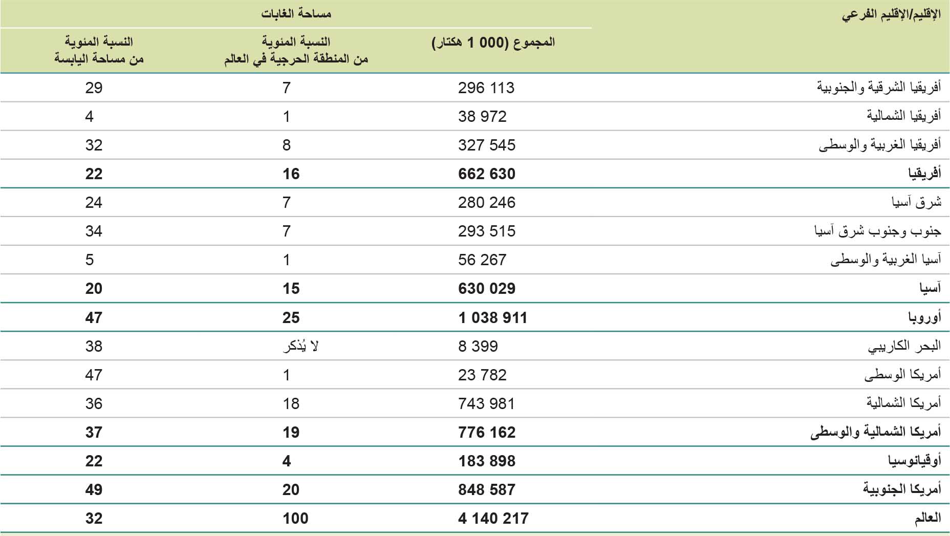 وتُقدر مساحة الغابات في العالم في عام 2025 بـحدود 4.14 مليار هكتار، ما يمثل 32 في المائة من إجمالي مساحة اليابسة. وتعادل هذه المساحة 0.50 هكتارًا من الغابات للفرد الواحد،6 مع أن الغابات غير موزَّعة بالتساوي بين سكان العالم أو من الناحية الجغرافية. وتقع خمسة وأربعون في المائة من غابات العالم في المجال الاستوائي، تليها المناطق الشمالية (28 في المائة) والمناطق المعتدلة (17 في المائة) وشبه الاستوائية (11 في المائة) (الشكل 2). ويبيّن الجدول 2 توزيع الأراضي الحرجية على الصعيدين الإقليمي والإقليمي الفرعي. وتستحوذ أوروبا على 25 في المائة من الأراضي الحرجية في العالم، تليها أمريكا الجنوبية (20 في المائة)، وأمريكا الشمالية والوسطى (19 في المائة)، وأفريقيا (16 في المائة)، وآسيا (15 في المائة)، وأوقيانوسيا (4 في المائة). ويبين الشكل 3 مساحة الغابات كنسبة من إجمالي مساحة الأراضي بحسب الأقاليم، ويبين الشكل 4 ذلك أيضًا بحسب البلدان والمناطق.