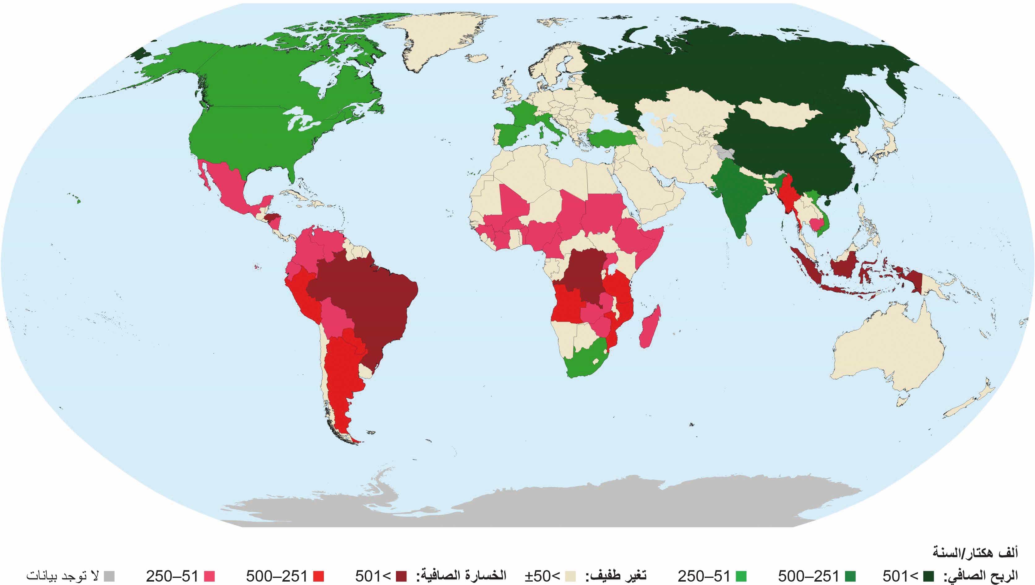 في ما يتعلق بهذا التقرير، جرى تحليل اتجاهات مساحة الغابات على مدى 35 عامًا ضمن ثلاث فترات زمنية: 1990-2000 و2000-2015 و2015-2025. وكانت تقديرات مساحة الغابات متاحةً لست سنوات لتقييم الموارد الحرجية في العالم (أي 1990 و2000 و2010 و2015 و2020 و2025) لكل البلدان والمناطق البالغ عددها 236 بلدًا ومنطقةً (يظهر الجدول 5 القيم الخاصة بهذه السنين بحسب الإقليم/الإقليم الفرعي). وقد انخفضت مساحة الغابات العالمية بنحو 203 مليون هكتار (مساحة تقارب مساحة المكسيك) بين عامَي 1990 و2025. وعلى النحو الموضح في الجدول 8، انخفض معدل الخسارة الصافية للغابات على مستوى العالم، من 10.7 مليون هكتار سنويًا في الفترة 1990-2000 إلى 3.68 مليون هكتار سنويًا في الفترة 2000-2015، ويرجع ذلك بشكل أساسي إلى الزيادات الكبيرة في مساحة الغابات في كندا والصين والاتحاد الروسي والولايات المتحدة الأمريكية. وارتفع المعدل السنوي لصافي الخسارة الحرجية في الفترة 2015-2025، ليبلغ 4.12 مليون هكتار، بسبب انخفاض معدل زيادة الغابات (أي التشجير والتوسع الطبيعي للغابات). ففي الصين، على سبيل المثال، انخفض صافي زيادة الغابات من 2.22 مليون هكتار سنويًا في الفترة 2000-2015 إلى 1.69 مليون هكتار سنويًا في الفترة 2015-2025؛ وفي كندا، انخفض صافي مكاسب الغابات من 000 513 هكتار سنويًا في الفترة 2000-2015 إلى 500 82 هكتار سنويًا في الفترة 2015-2025. وفي الولايات المتحدة الأمريكية، أصبح صافي زيادة الغابات البالغ 000 437 هكتار سنويًا في الفترة 2000-2015 خسارةً صافيةً في مساحة الغابات تبلغ 000 120 هكتار سنويًا في العقد الأخير. ويبيّن الشكل 5 التغير الصافي السنوي في مساحة الغابات بحسب البلدان والمناطق في الفترة 1990-2025.
