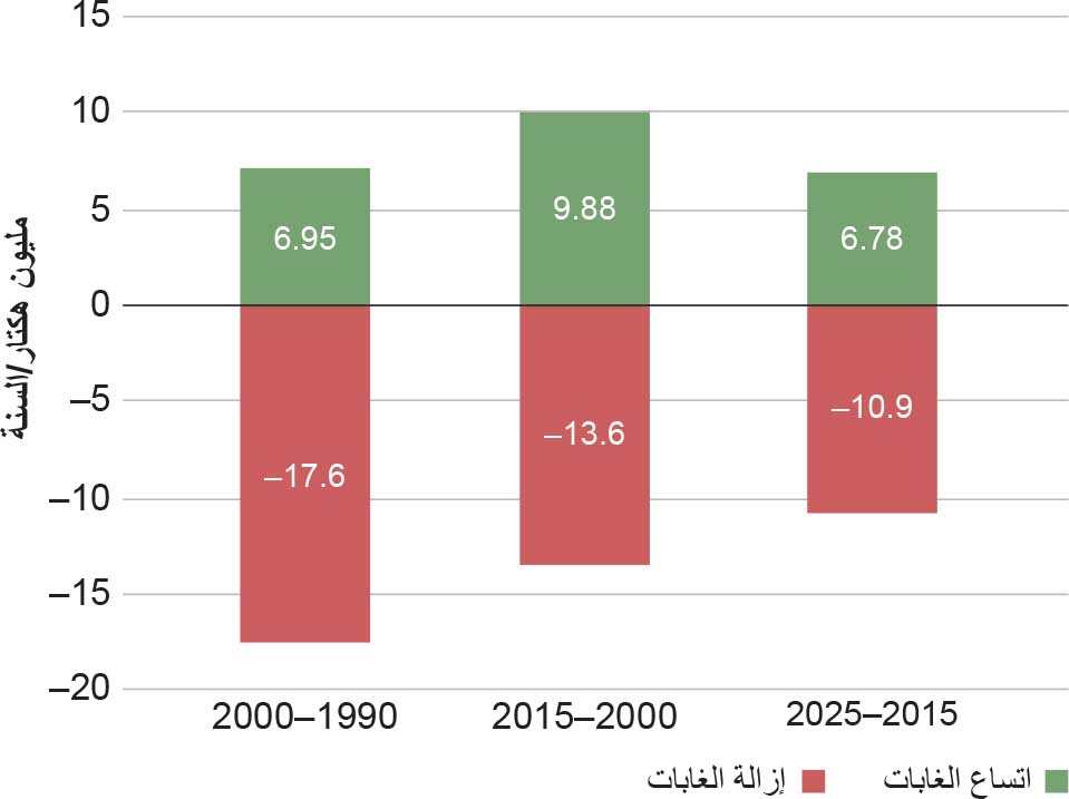 ووقعت خسائر تُقدَّر بنحو 489 مليون هكتار من الغابات بسبب إزالة الغابات بين عامَي 1990 و2025، على الرغم من تباطؤ المعدل خلال هذه الفترة. وبلغ المعدل السنوي لإزالة الغابات 17.6 مليون هكتار في الفترة 1990-2000، و13.6 مليون هكتار في الفترة 2000-2015، و10.9 مليون هكتار في الفترة 2015-2025 (الشكل 7).