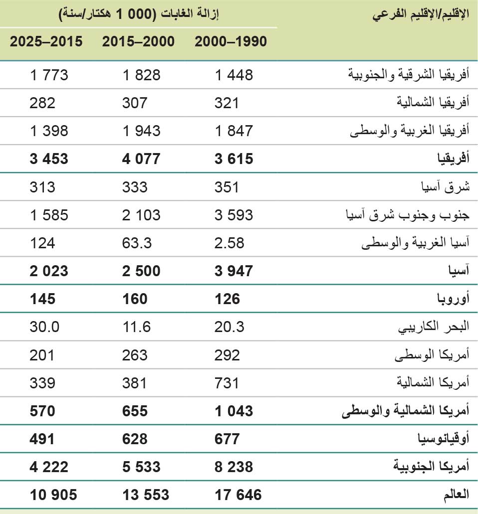 وشهدت المنطقة الاستوائية معظم عمليات إزالة الغابات (88 في المائة) بين عامَي 1990 و2025 رغم تراجع المعدل السنوي لإزالة الغابات هناك من 15.9 مليون هكتار في الفترة 1990-2000، إلى 11.9 مليون هكتار في الفترة 2000-2015، ثم إلى 9.42 مليون هكتار في الفترة 2015-2025 (الجدول 9). وانخفض المعدل السنوي لإزالة الغابات في المنطقة شبه الاستوائية، من 1.09 مليون هكتار في الفترة 1990-2000 إلى 0.73 مليون هكتار في الفترة 2015-2025، ولكنه زاد قليلًا في المنطقتَين المعتدلة والشمالية.