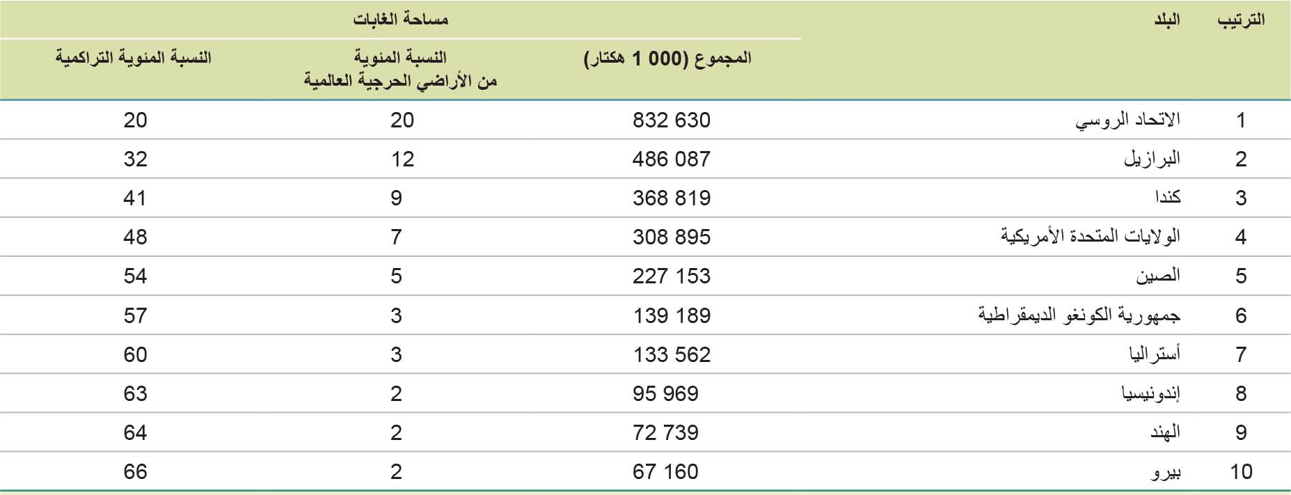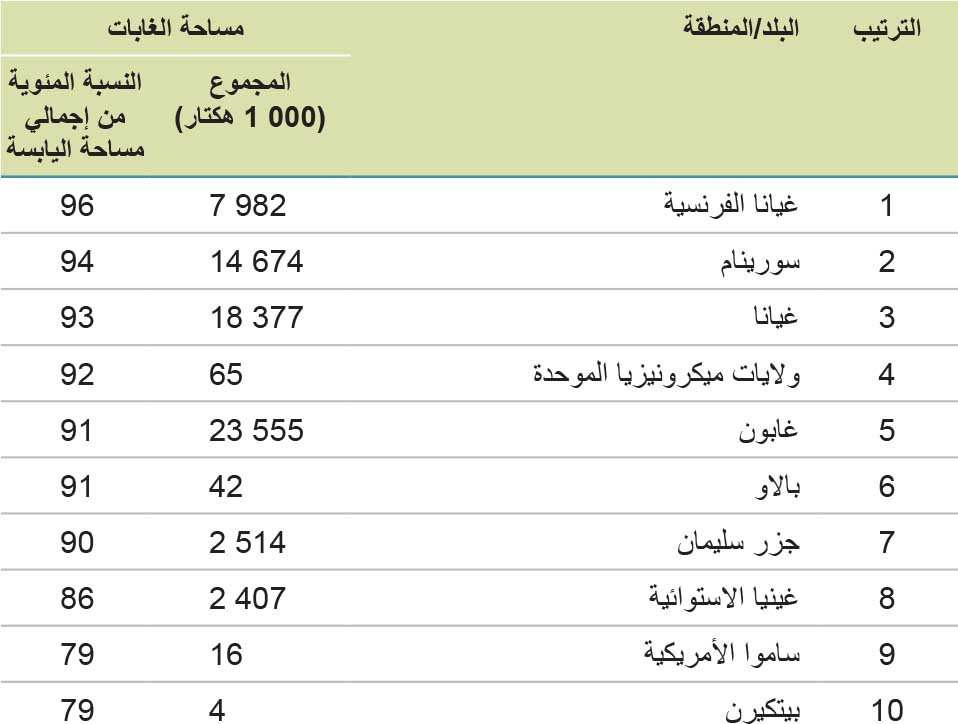 وأكثر من نصف مساحة الغابات في العالم (54 في المائة) موجودة في خمسة بلدان فقط (بالترتيب التنازلي)- الاتحاد الروسي والبرازيل وكندا والولايات المتحدة الأمريكية والصين (فهي أيضًا أكبر خمسة بلدان في العالم من حيث المساحة، وإن لم يكن بالترتيب نفسه7). وتضمّ البلدان العشرة ذات مساحة الغابات الأكبر حوالي الثلثين (66 في المائة) من الإجمالي العالمي (الجدول 3). وأفادت سبعة بلدان ومناطق- جزر فوكلاند (مالفيناس)8 وجبل طارق والكرسي الرسولي وموناكو وناورو وجزر سفالبارد وجان مايين وتوكيلاو- عن عدم وجود غابات فيها على الإطلاق، وتشكل الغابات أقل من 10 في المائة من إجمالي مساحة الأراضي في 49 بلدًا ومنطقةً أخرى. ويبيّن الجدول 4 البلدان والمناطق العشرة الرئيسية من حيث مساحة الغابات كنسبة مئوية من إجمالي مساحة اليابسة؛ وتبلغ النسبة فيها 90 في المائة أو أعلى في سبعة بلدان ومناطق.