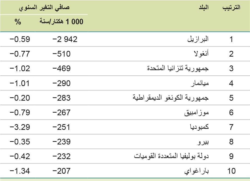 ويبين الجدول 7 البلدان العشرة الرئيسية في جميع أنحاء العالم من حيث متوسط الخسارة السنوية الصافية في مساحة الغابات بين عامَي 2015 و2025، ويبين الجدول 8 البلدان العشرة الرئيسية من حيث متوسط الزيادة السنوية الصافية في مساحة الغابات في الفترة نفسها.