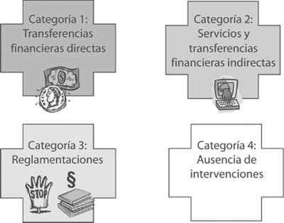 Esta última categoría abarca la esfera de la ausencia de intervención gubernamental y puede ser la más difícil de determinar. Incluye la inacción del gobierno que permite a los productores imponer - a plazo corto o largo - determinados costos de producción a otros, inclusive a los recursos ambientales y naturales. Por definición, no implican un gasto para el gobierno (pero pueden representar un ingreso no percibido y su valor para la industria es implícito).