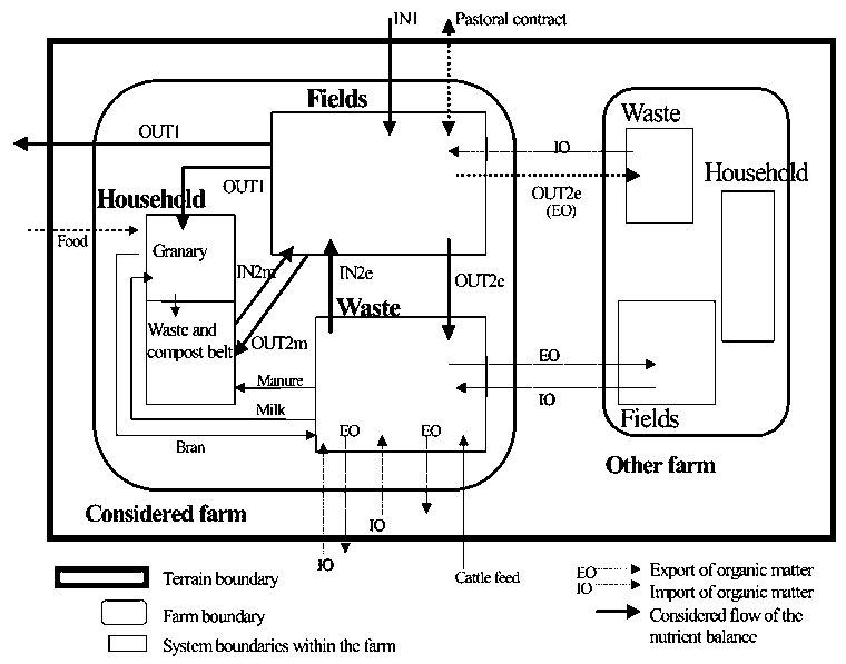 One study (Kanté, 2001) compared two villages in southern Mali with similar farming systems but different land pressures as a result of higher population density and a higher ratio between cultivated land and total land. This study relied partly on CMDT farm-survey data. The nutrient-flows calculations were as per Stoorvogel and Smaling (1990), with slightly modified regression models for OUT3 and OUT4. The difficult flows were estimated, while the nutrient flows of the partial balance were measured. They were quantified on the basis of a general diagram of how farmers perceive nutrient flows to occur (Figure 13). Partial balances (IN1, IN2, OUT1 and OUT2) were calculated per crop, per farm, per wealth class and per village. Finally, the complete balance with all inflows and outflows was calculated. Nutrient losses resulting from deep latrines (OUT6) were introduced at the microlevel, because the whole farm was considered part of the system.