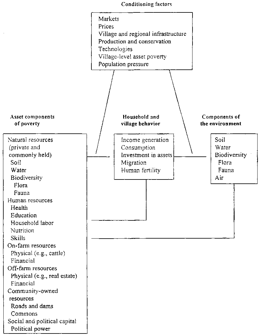 Vosti and Reardon (1997) present an interesting conceptual model of the linkages between poverty and the environment that helps to highlight the complexity of the relationships. Poverty is seen to be the product of "asset" components comprising natural resources (private and commonly held), human resources, on-farm resources, off-farm resources, community-owned resources and social and political capital. These links are shown in Figure 2. These determine household and village behavior in terms of income generation, consumption, investment in assets, migration and human fertility, which in turn has implications for use and management of the natural resource component that, - determines the asset components of poverty. How natural resources are used and managed feeds back as a determinant of the asset components of poverty. A set of conditioning factors governs the relationship between the asset components of poverty and household and village behavior and between the household and -village behavior and the natural resource components. These conditioning factors are markets (prices), village and regional infrastructure, technologies (production and conservation), village level asset poverty and population pressures.