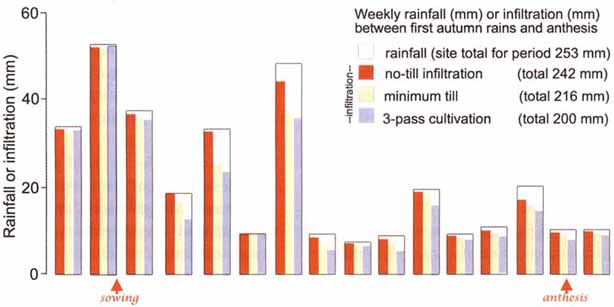 Rainfall and infiltration data. These data are from the third year of a study after multiple, minimum and no-till treatments began. No-till used a double disc seeder opener at sowing such as pictured earlier. Minimum tillage used full cut-out tine points 50 mm deep, 3-pass cultivation used wide tine points 80 mm deep. Rainfall is the full height of each histogram. Sowing and anthesis dates are marked.