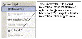 The default option for FIAP is manual recalculation. This means that when new data is added or existing data is amended FIAP will NOT automatically update any relevant figures. To update the user must click the button marked Calc that appears on each screen that shows variables that change. Automatic recalculation means that any change in a single cell are immediately reflected in all relevant cells. It switch between the two modes use the Options menu and choose the option required. The one currently in use will be blanked out.
