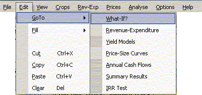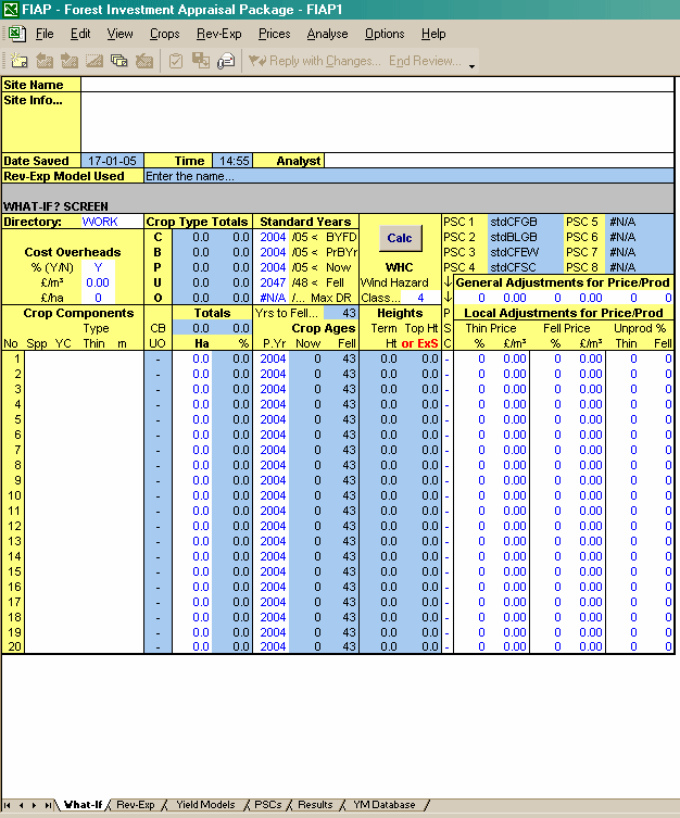 This is the most important screen of the package. The What-If screen can be thought of as the ‘master’ screen that brings the other screens together. The screen contains data on site information, overheads, time scales, crop components, wind hazard and yields. Typical use of the package will involve constantly returning from the other screens to the What-If screen.