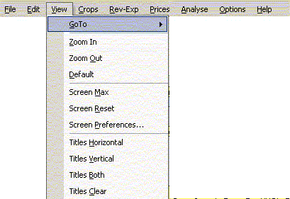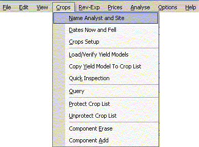 Access these menus either by moving the mouse pointer to the word and clicking the left-hand button, or by pressing the Alt key followed by the underlined letter. Select the command either by typing the underlined letter of the command in the pop-down menu, or by clicking it with the mouse, or moving the highlight down to the command you want (with the mouse or the arrow keys) and pressing Enter. For instance in the example to the left the Query option from the Crops menu could be chosen by using the mouse or by typing Alt and C followed by Q. The use of these commands is described at appropriate points throughout this User Guide.