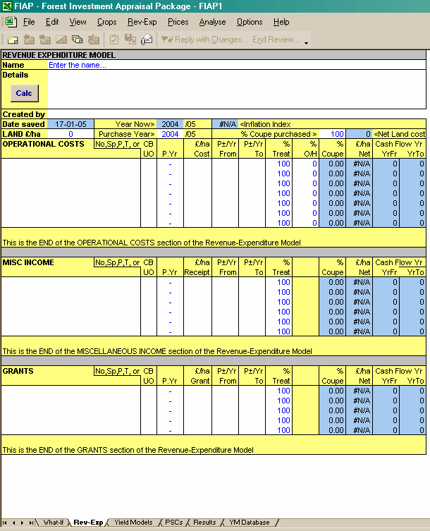 The Rev-Exp screen contains the Revenue- Expenditure model that details costs, miscellaneous income from minor forest produce, and grants (if any). There is space for site information, descriptive detail of the model etc. The screen is small to begin with but all sections can be easily expanded to allow for extremely complicated analysis. Data can be entered and grouped in a variety of convenient ways. Revenue and Expenditure is dealt with in section 5.