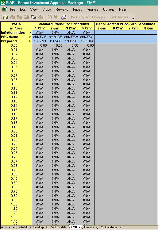 The PSCs screen details the price-size curves (PSCs) used by the model. FIAP contains four standard long- term PSC’s prepared by the Forestry Commission. There is space for four more price-size curves that may be defined by the user to reflect local data. There is also the option of displaying any of the curves graphically. Price Size curves are dealt with in section 6.