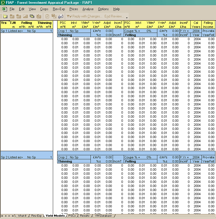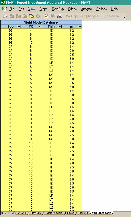 This screen provides a point of reference for all the various yield models available in the package. There is the option of sorting by yield class, thinning type and initial spacing. See section 7.