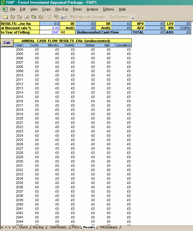 As the name suggests the results screen is where the appraisal results can be found. It is dealt with in section 8. There are ten standard summary results shown at all times and there is the option of calculation on a per hectare basis or for the coupe as a whole. The required discount rate is entered on this screen. Results can be shown graphically if required. In addition there is the facility to calculate the year of maximum discounted revenue.