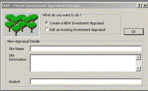 You will now be presented with a screen asking if you wish to Create a New appraisal or Edit an existing one. Use the mouse to click on the option required. If you create a New appraisal you are presented with a series of dialogue boxes that allow entry of details such as site name, location and the analyst. Use the mouse to move from box to box (alternately the TAB key will move through the boxes in order). Mistakes can be corrected using the Delete or Backspace keys or at a later stage - see Section 2.1. When finished click on OK. You will now move onto the package itself. The initial screen is the What-If screen. The next section deals with the different screens available.
