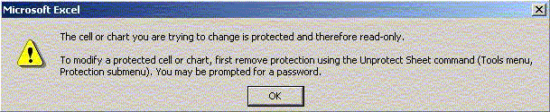 FIAP uses many formulae, some of considerable complexity, but you do not have to concern yourself with these Either they are protected to prevent inadvertently altering them or, where you can overwrite them as part of the analysis, FIAP also has commands to reinstate them should you change your mind. This User Guide has instructions for reinstating simple entries manually. The cells you can write in have a white background and any entries they contain are in blue. If try and change a cell that is protected (locked) you will get an error message. Click on OK to continue.