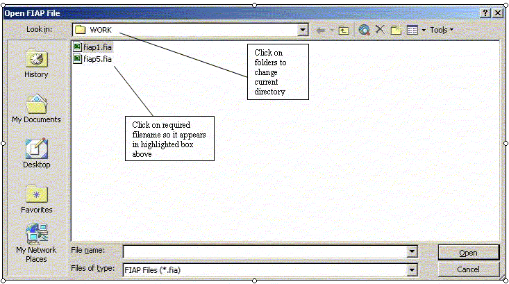 If you choose to edit an existing appraisal you are presented with a dialogue box asking for the file name. FIAP files appear with a .FIA extension and the default directory is shown onscreen. The current directory can be changed as usual by clicking on the folders. Select the filename required by clicking on it so it appears in the highlighted box above and click on OK when ready. The previous appraisal will now be loaded and you will be taken to the What-If screen.