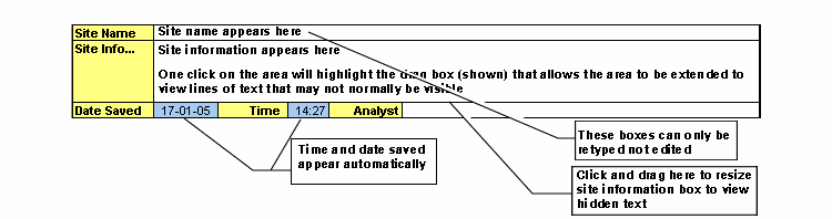 The site details section may well require additions or changes over time and as such has been set up to allow editing without re-typing. Click once on the area to bring up the area frame and click again to position the vertical cursor which can be used to edit the text as required. When editing is finished simply click elsewhere on the screen. This area has been set up as a primitive word-processor so words will wrap across lines automatically and pressing Return will insert a new line. You may find that there is not enough room to display all the text you have written - to see hidden text, click once on the area to highlight the area frame, click on the mark halfway along the bottom of the frameline and drag the bottom border of the frame down until all the text is visible. This may now obscure other parts of the sheet so you may have to reverse the process once you have finished with the text.