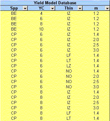 The yield model database contains the file names of the yield models. The file names are made up of four parts; the species name, the yield class, the thinning regime and the spacing. It is important to get the 4 parts exactly right in the What-If screen in order to successfully load the data from the yield-model sub-directory. The YM Database was designed to ease this process and the Yield Models screen allows detailed examination of selected Yield models. Both screens are accessible through the tabs at the base of the screen or through the Goto command in the Edit and View menus.
