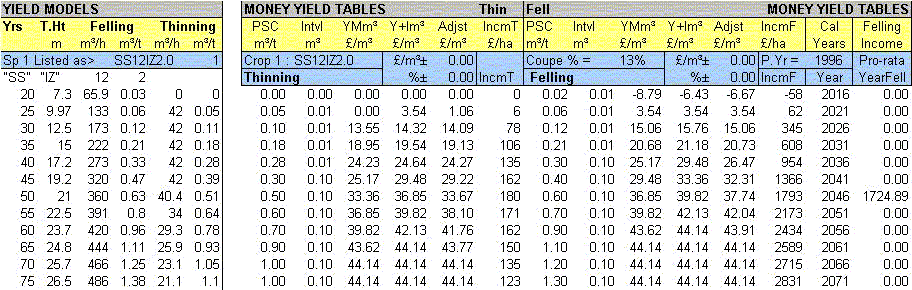 It can be seen across the top of screen in the blue section are the column titles Spp, YC, Thin and m, and next to these are boxes containing arrows. These arrows are to help you select what you want rather than having to use the scroll bar on the right hand side. If you click on the Spp arrow you are shown a list of all the species available. If, for example, you select NS (Norway Spruce) you will be shown all the NS yield models. If you then select 20 from the YC arrow you are shown all the NS yield class 20 models (all 18 of them). Thin and m can be selected as well.