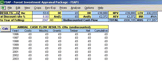 The final two summary results are undiscounted cash figures for the specified range of years total net cash for the duration specified, and the annual average over that period These figures may be useful for farmers and other private investors considering forestry, who want to know their projected cash flow commitments, but who may prefer to apply their own intuitive discount rate Such investors may also find the annual cash flow figures of interest.
