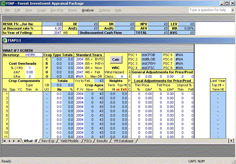 You can change one or more parameters and recalculate to see the effects. By calculating results successively for two carefully selected sets of parameters, the financial implications of various kinds of change can be measured, e.g., felling before or after the financially optimum year, changing the proportions of the crop components, or changing the species themselves within those components. FIAP can calculate results for fresh assumptions very quickly, but it does not actually compute the differences directly.