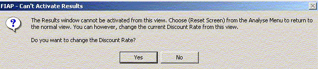 At any time you can see these summary results by selecting GoTo from either the Edit or the View menus and choosing Summary Results. Whenever you go into the results screen FIAP automatically calculates the results to ensure that the results you are looking at are up to date. However, it is often more convenient to have them visible beside either the What-if screen or the Revenue-Expenditure model, especially during sensitivity analyses where the effect of changing individual parameters is being studied. See section 8.5.