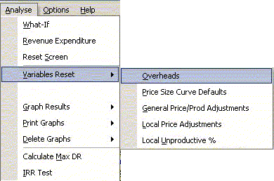 This command resets the three overhead settings in the What-if? screen, Y for percentages and zero for the other two. It does not alter the percentage figures entered against each cost in the Revenue-Expenditure model.