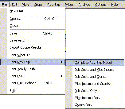 The Print Rev-Exp command offers you a choice of which parts of the Revenue-Expenditure model to print, because if parts of it have not been used you may not want to print it all. The final option allows you to make your own selection. This command is also available from within the Rev-Exp menu.
