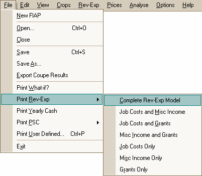 Most of the print commands are located in the File menu, but for convenience some of them can also be accessed under the Rev-Exp and Prices menus. There is also a Print Graphs command under the Analyse menu, and more about that command can be found in Section 8.7.7. The following are the commands in the File menu.