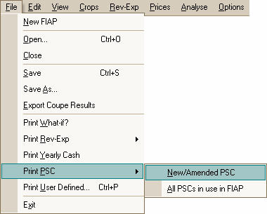 The Print PSCs command offers you a choice of printing only the new or amended PSC, or all those currently in use in FIAP. This command is also available from within the Prices menu.