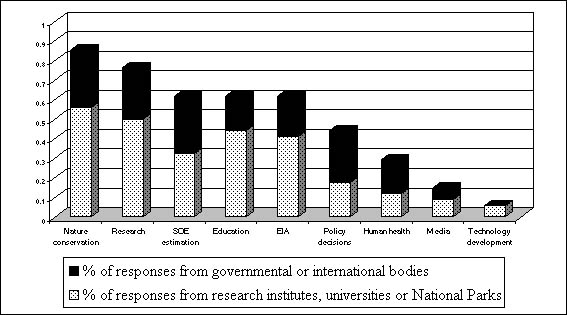 Environmental data is currently used for nature conservation and research purposes and to a lesser extent for decision-making, as shown in the analysis of the questionnaire responses (see Figure 2.1). The results clearly demonstrate that a wider use of data should be encouraged. This is where GTOS could play an important role.