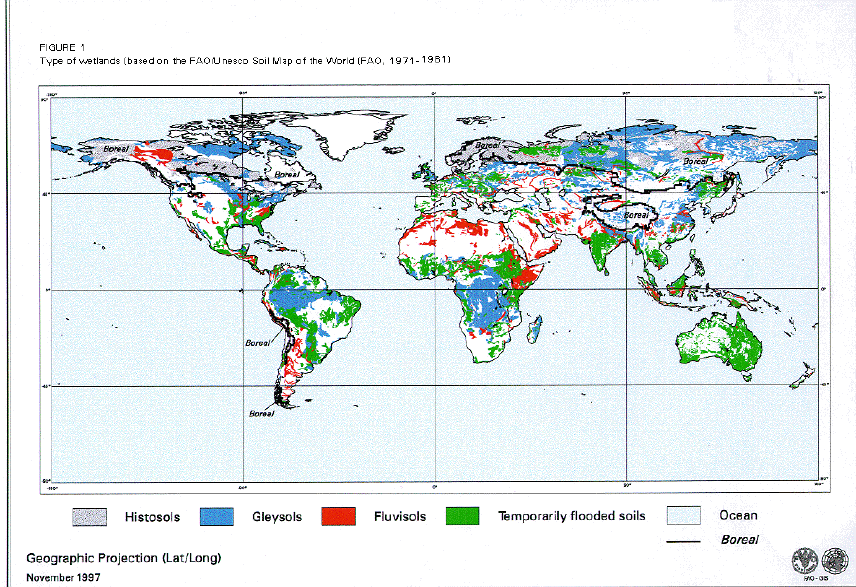 The total extent of the Histosols in the world is about 275 million ha (FAO, 1991b) illustrated in Figure 1 (world) and Figure 2 (Africa), with more than half occurring in boreal and cold climates in northern Finland, western Scotland, Central Canada, Alaska and east of the Ural mountains in Siberia where they occur in association with Gleysols (see following section).