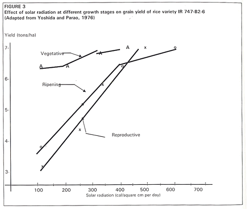 Solar radiation is essential for photosynthetic activity. As such, the growth, development and yield of rice plants are affected by the level of solar radiation. Rice yields are closely correlated to the solar radiation during the reproductive and ripening phases of the rice plants (Figure 3). The average solar radiation for the rice growing season in Mediterranean countries, Australia, and USA is about 100 cal/cm2 per day greater than in monsoon tropical countries. In the tropical climate, solar radiation during dry season is normally much higher than during wet season.