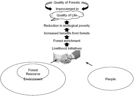 The 'Livelihood System' means developing the forests in a manner that the outputs from the forest provide the community with substantial economic benefit in perpetuity to attain a satisfactory level of life. The schematic representation in Figure 2 explains the concept of Livelihood Initiatives through Forest Enrichment (LIFE).