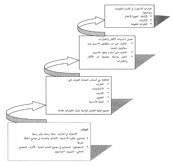 التعرف على الاحتياجات وتقديرها | نشر المعلومات | من يحتاج إلى التعلّم | طريقة الاتصالات | نشر المعلومات | من يدفع مقابل التثقيف؟ |