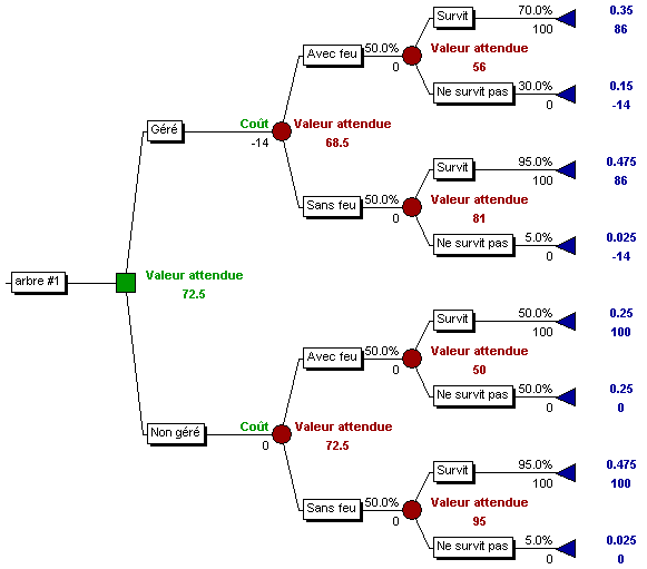 A titre d'exemple, supposons que la valeur d'une population est de 100 unités et que le coût des activités de gestion est de 14 unités. Supposons en outre que la probabilité qu'un feu se déclare soit de 0,5 et que la probabilité de survie de la population sans intervention soit de 0,5. Toutefois, si la gestion peut améliorer la reproduction et augmenter l'effectif minimal de la population, la probabilité de survie malgré le feu peut être de 0,7. Si aucun feu ne se déclare, nous supposons que la probabilité de survie est de 0,95. La valeur prévue grâce à la gestion peut être alors calculée comme suit: