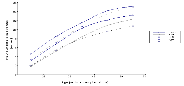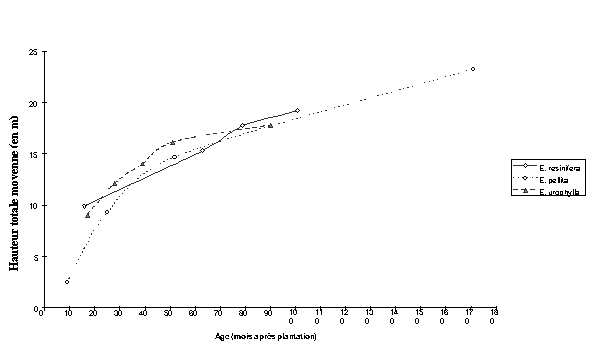 Les espèces pures les mieux adaptées aux conditions écologiques du Congo sont peu productives (7 à 10 m3/ha/an d'accroissement maximum sur le volume). La sélection après hydridation interspécifique a permis d'obtenir des hybrides conjugant adaptation et vigueur. C'est ainsi que les croisements d'E. grandis (possédant une croissance vigoureuse, une très bonne forme, une bonne aptitude au bouturage, une bonne qualité technologique pour la pâte mais très mal adapté4 ) et d'E. urophylla (plutôt adapté, mais ayant une mauvaise aptitude au bouturage, une qualité moyenne pour la pâte, et une forme moins bonne que l'E. grandis) ont permi l'obtention d'hybrides E. urophylla x grandis alliant à la fois vigueur et adaptation, facilité de multiplication et bonne aptitude technologique pour la pâte, et produisant 25 à 40 m3/ha/an en plantations expérimentales. Les figures 3 et 4 donnent un aperçu sur la croissance de quelques espèces pures et hybrides inter-spécifiques.