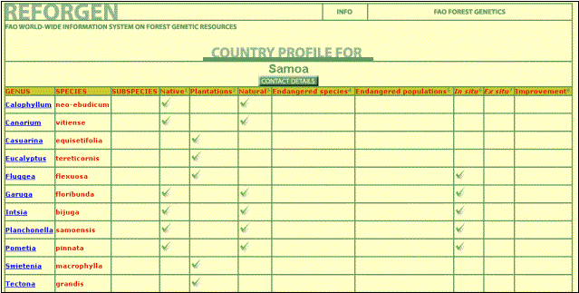 Comme mentionné plus haut, le système comprend actuellement des informations sur les activités liées aux ressources génétiques forestières menées dans 146 pays. Les informations portent sur plus de 1 600 essences forestières. Ces informations sont assez bien réparties entre régions et entre pays développés et en développement. Elles sont cependant loin d'être complètes et la quantité d'informations actuellement disponibles dans le système varie beaucoup d'un pays à l'autre, allant de quelques informations sur des essences forestières essentielles pour certains pays à des informations détaillées sur un large éventail d'essences et d'activités pour d'autres pays.