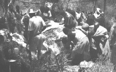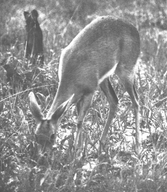 FIGURE 4. - Peinture rupestre boschiman représentant un homme en train d'offrir de la nourriture à un élan. Il n'en faut pas conclure que les antiques habitants de la brousse avaient conscience des possibilités de domestication telles que nous les comprenons aujourd'hui, mais il semble probable qu'ils savaient combien l'élan est facile à apprivoiser et réagit aux bons traitements.