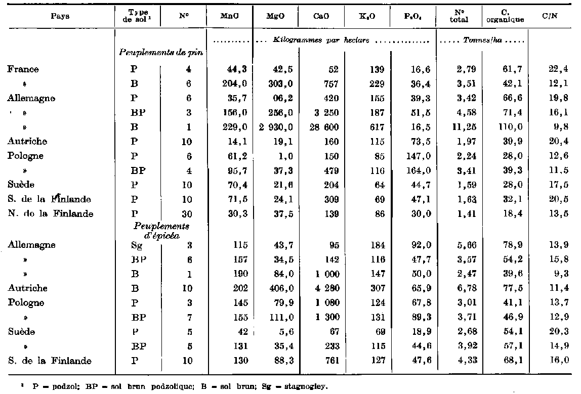 Il est impossible de présenter ici l'ensemble des résultats obtenus au cours de cette étude. Cependant, pour donner au lecteur quelque idée du bilan des éléments nutritifs, on a fait figurer dans le tableau 1 les quantités moyennes d'éléments échangeables, l'azote total et le carbone organique dans les horizons de surface. Ce tableau montre clairement que la teneur en éléments nutritifs varie de façon considérable suivant les pays et les types de sol. Dans un pays donné, la teneur en éléments nutritifs est presque sans exception plus élevée dans les sols bruns que dans les podzols. Dans les peuplements de pins, le fait le plus remarquable est la faible teneur en calcium dans les sols français en magnésium dans les podzols polonais qui, par contre, ont une teneur en phosphore élevée. On a obtenu des valeurs étonnamment semblables dans les sols finlandais et suédois. Dans les peuplements d'épicéa, il faut surtout noter les grandes quantités de phosphore soluble au lactate dans les sols polonais. Ces résultats ne permettent pas une comparaison générale des sols de pin et d'épicéa, mais le bilan en éléments nutritifs semble varier beaucoup suivant les circonstances.