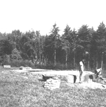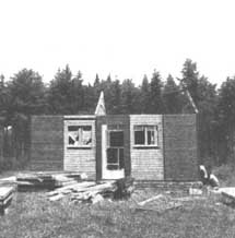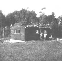 A partir des fondations (figure 1) - constituée par une dalle de ciment s'élevant à 20 centimètres au-dessus du niveau du sol pour éviter les risques de pourriture, d'altération ou d'attaques par les termites - il faut environ 16 heures pour monter complètement la maison. Les éléments des murs sont des panneaux de 1,20 x 2,40 mètres. Le bois utilisé Cupressus lusitanica, provenait de l'éclaircie d'une plantation âgée de 23 ans. Les grumes ont été débitées à la scie à refendre en planches qui ont été ensuite sommairement rabotées.
