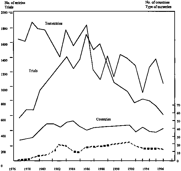 Over the years, INGER has been remarkably successful and popular with NARS breeders. Of the 42,000 lines evaluated, 5,300 have been used as parents by NARS breeders and 429 have been released directly as 618 varieties in 66 countries. In the past, this success has enabled IRRI to attract external funding for INGER, initially by UNDP and latterly by BMZ. However, since 1985, the numbers of entries and the numbers of trials have declined (Figure 5.1) due both to funding constraints and attempts to streamline and make the operation more effective. Trials in Africa have almost ceased. The role of INGER in Latin America has been taken over to some extent by the Fundación Latinoamericana para el Arroz de Riego (FLAR). However, FLAR does not serve all ecosystems or countries in Latin America. Moreover, the position of INGER coordinator at IRRI remains vacant.