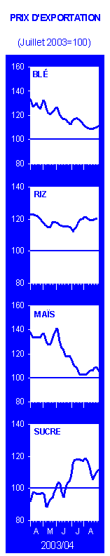 Les dernières prévisions de la FAO concernant la production céréalière mondiale en 2004 ont été relevées de 29 millions de tonnes depuis le rapport précédent, pour s’établir à 1 985 millions de tonnes, ce qui correspond à l’utilisation prévue en 2004/05. Ainsi, il ne sera pas nécessaire d’opérer de nouveau des prélèvements importants sur les stocks céréaliers mondiaux après les forts reculs de ces quatre dernières années.