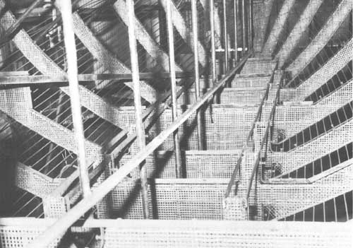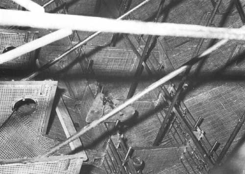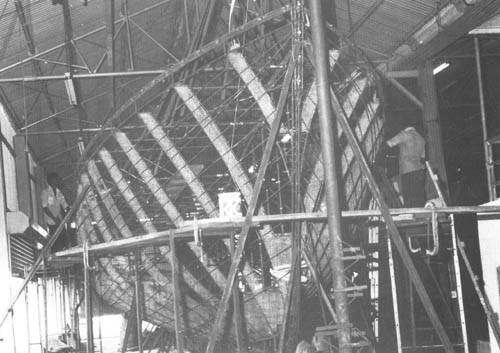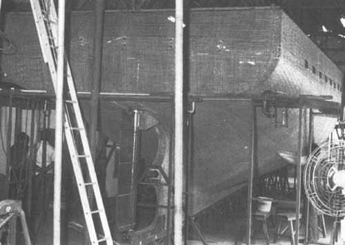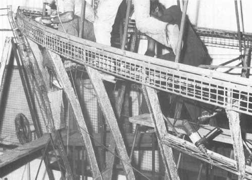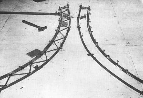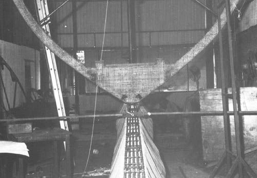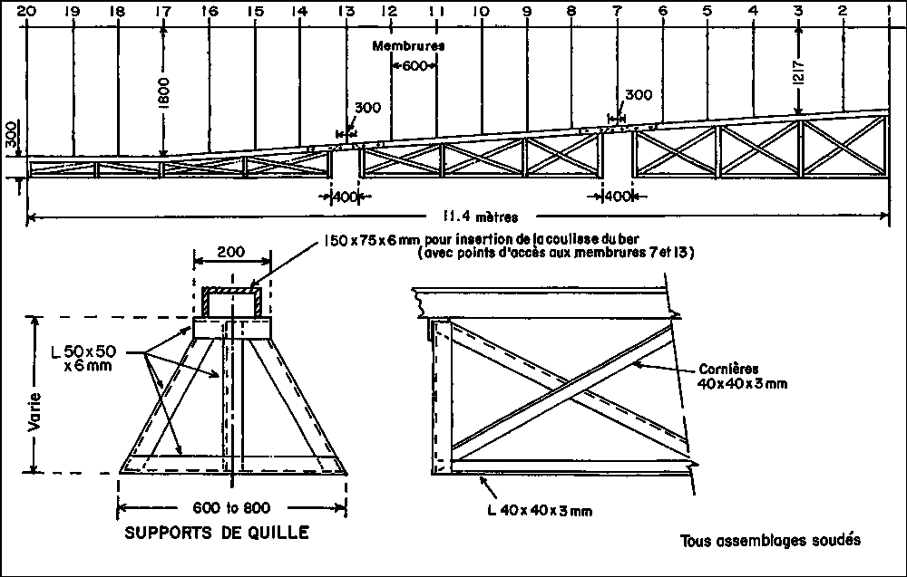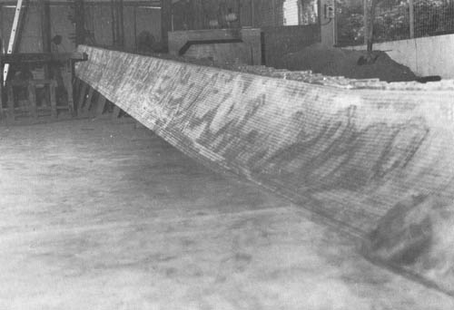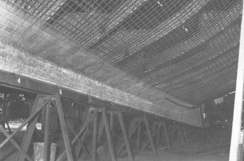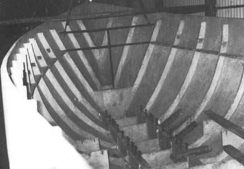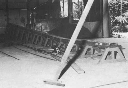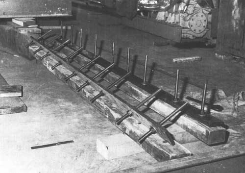 Comme on l'a vu plus haut (voir page 13) au sujet de la charpente de la toiture, il est pratique de disposer d'IPN de 160 mm (Euronorm 24.62), alignés dans l'axe de la coque dans le chantier. Ceci aidera à soutenir la coque, ce qui est nécessaire pour maintenir stable l'armature pendant que l'on effectue la construction et la coulée et la prise du mortier bien que le gabarit de quille et le sol supporteront tout le poids de la construction