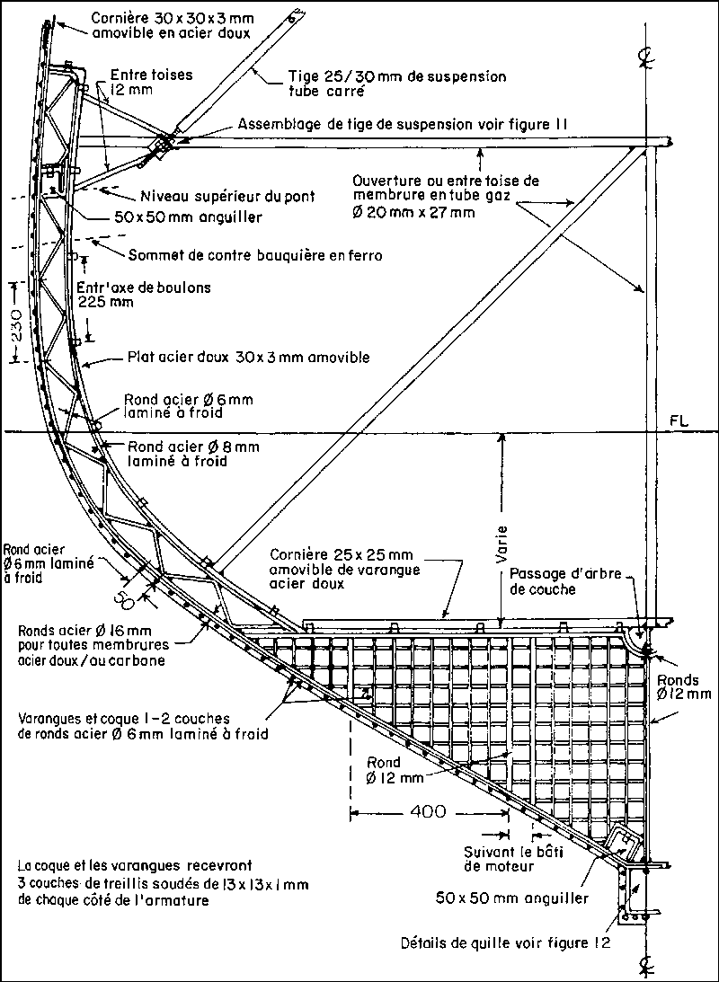 On peut cependant voir, en utilisant les spécifications de la coque et le dessin donnant les détails d'armature (réf Fig. N°10 et dessins N° IND 101 P4 a, b, c), que les varangues et porques doivent avoir une épaisseur finie de 25 mm. Pour créer le chant nécessaire pour les ouvriers et un guide d'épaisseur, on utilise un fer plat réutilisable de 25 × 3 mm sur la face interne de la porque et une cornière de 25 × 25 × 3 mm sur le chant supérieur des varangues. Le fer plat et la cornière sont percés pour recevoir des boulons de 8 mm à tête hexagonale dont les axes sont espacés de 225 mm pour permettre d'enlever les bordures métalliques après la fin de la coulée. Pour créer un évidement pour les écrous sur le bord des membrures, une ou deux (deux sont préférables) rondelles grower de 8 mm seront incorporées. Après enlèvement des boulons et des rondelles, ces évidements seront remplis de résine époxy quand le mortier aura sèché et sera prêt à recevoir les équipements.