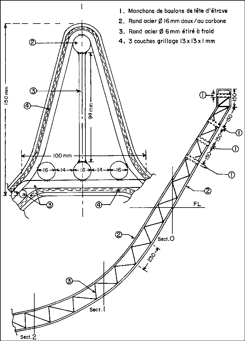 Avec une largeur de quille de 150 mm par exemple, on trouvera judicieux d'utiliser 5 tiges de diamètre 16 mm espacées de 14 mm entre elles (voir fig. N° 12). Ceci laisse assez de place pour permettre la pénétration du mortier en utilisant une aiguille vibrante lors de la coulée dans la région de la quille.