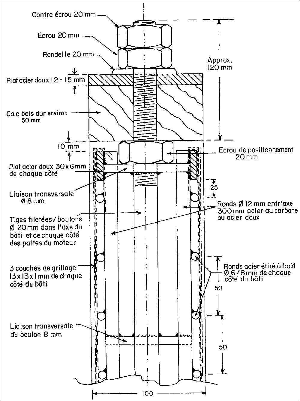 En choisissant les boulons de 8 mm, il est préférable de prévoir un contre écrou de sorte qu'aucun des boulons ne se desserre au cours de la construction à venir. Ce travail est nécessaire pour obtenir une bordure amovible de sorte que, après la prise totale du mortier, la partie métallique puisse être enlevée, donnant ainsi un chant de mortier bien fini aux porques et varangues.